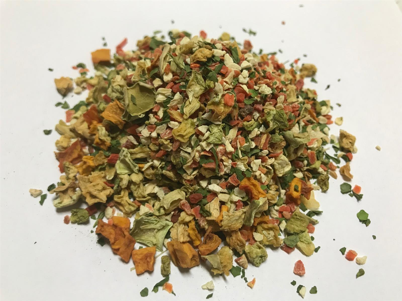 Mischen Sie 1/5 Gemüseflocken mit 4/5 warmem Wasser und lassen Sie diese 15 Minuten einweichen.