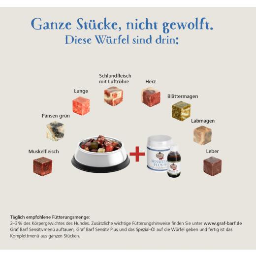 Das Graf Barf Sensitivmenü Lamm ist besonders schonend da verdauungsempfindliche Innereien reduziert sind und auf Knochen verzichtet wird – darüber hinaus ist es artgerecht, stückig, roh, natürlich, gesund, einfach, abwechslungsreich, ausgewogen.